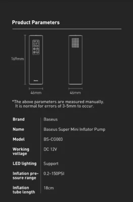 Baseus Super Mini Tire Pump with LED Light – 12V, PSI/BAR, 30 l/min