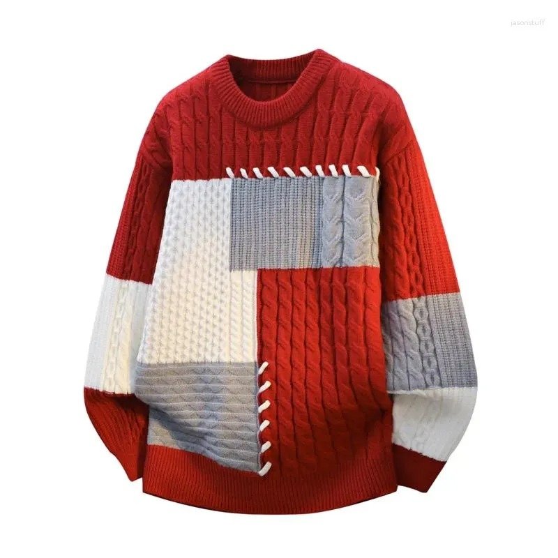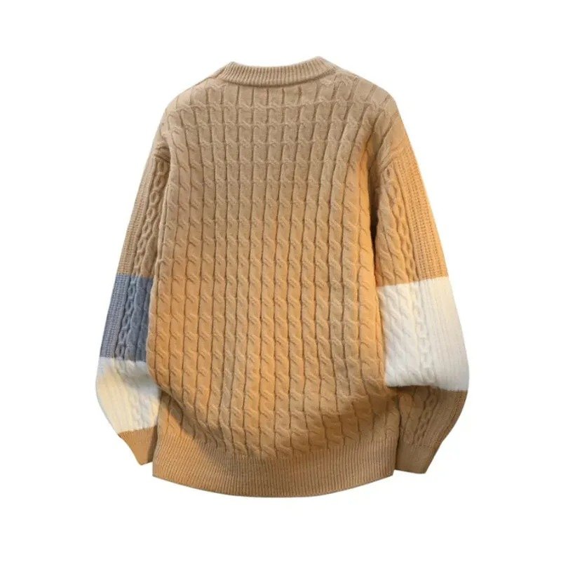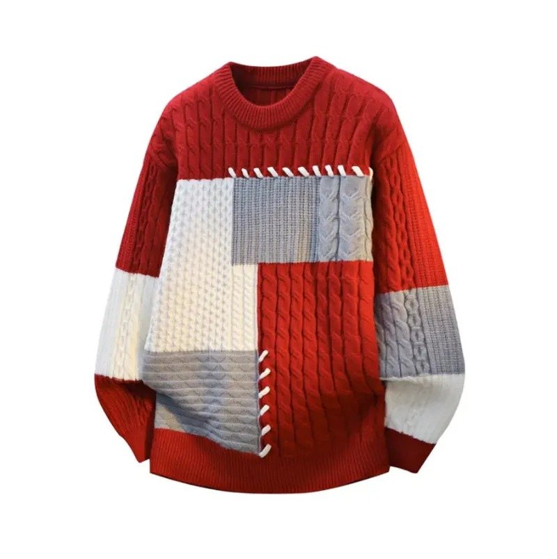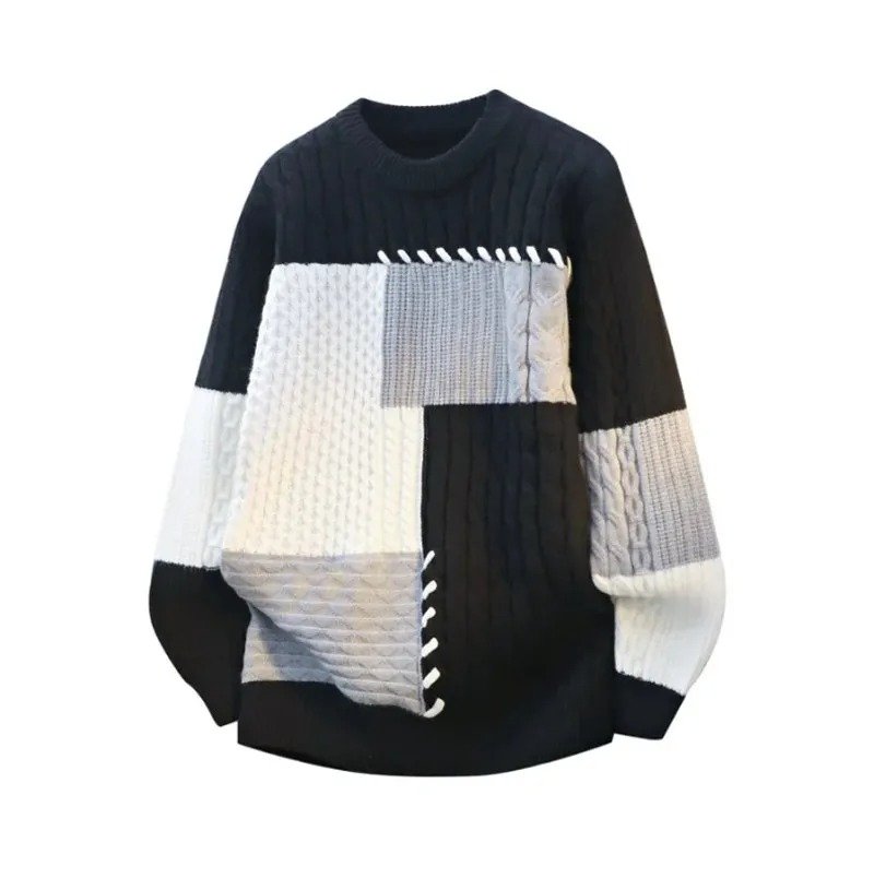 Patchwork Knit Design: This men’s sweater features a stylish patchwork pattern that combines a fashionable aesthetic with a thick, round-neck knit that offers warmth and comfort during the fall and winter months, making it perfect for casual and semi-formal occasions.
