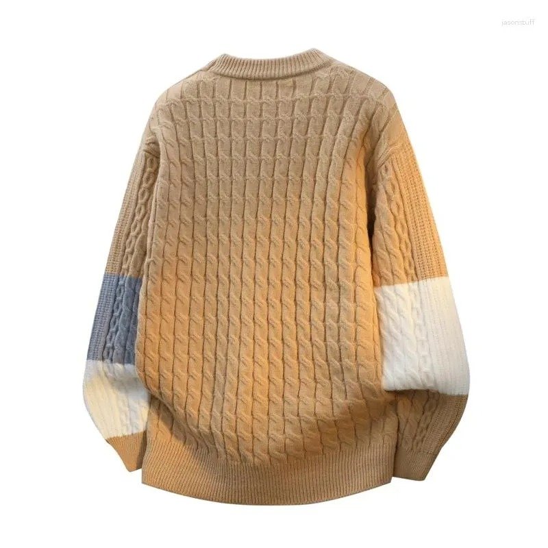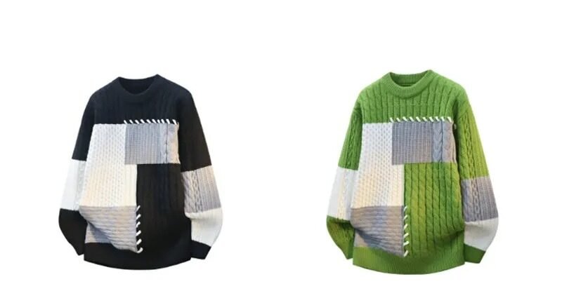 - Patchwork Knit Design: This men’s sweater features a stylish patchwork pattern that combines a fashionable aesthetic with a thick, round-neck knit that offers warmth and comfort during the fall and winter months, making it perfect for casual and semi-formal occasions.