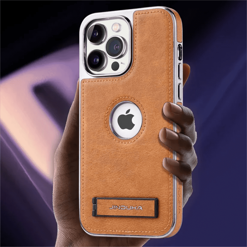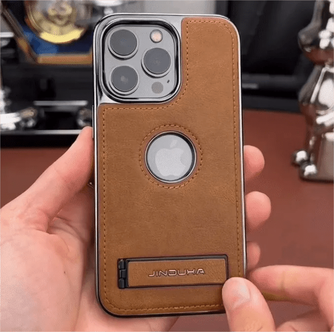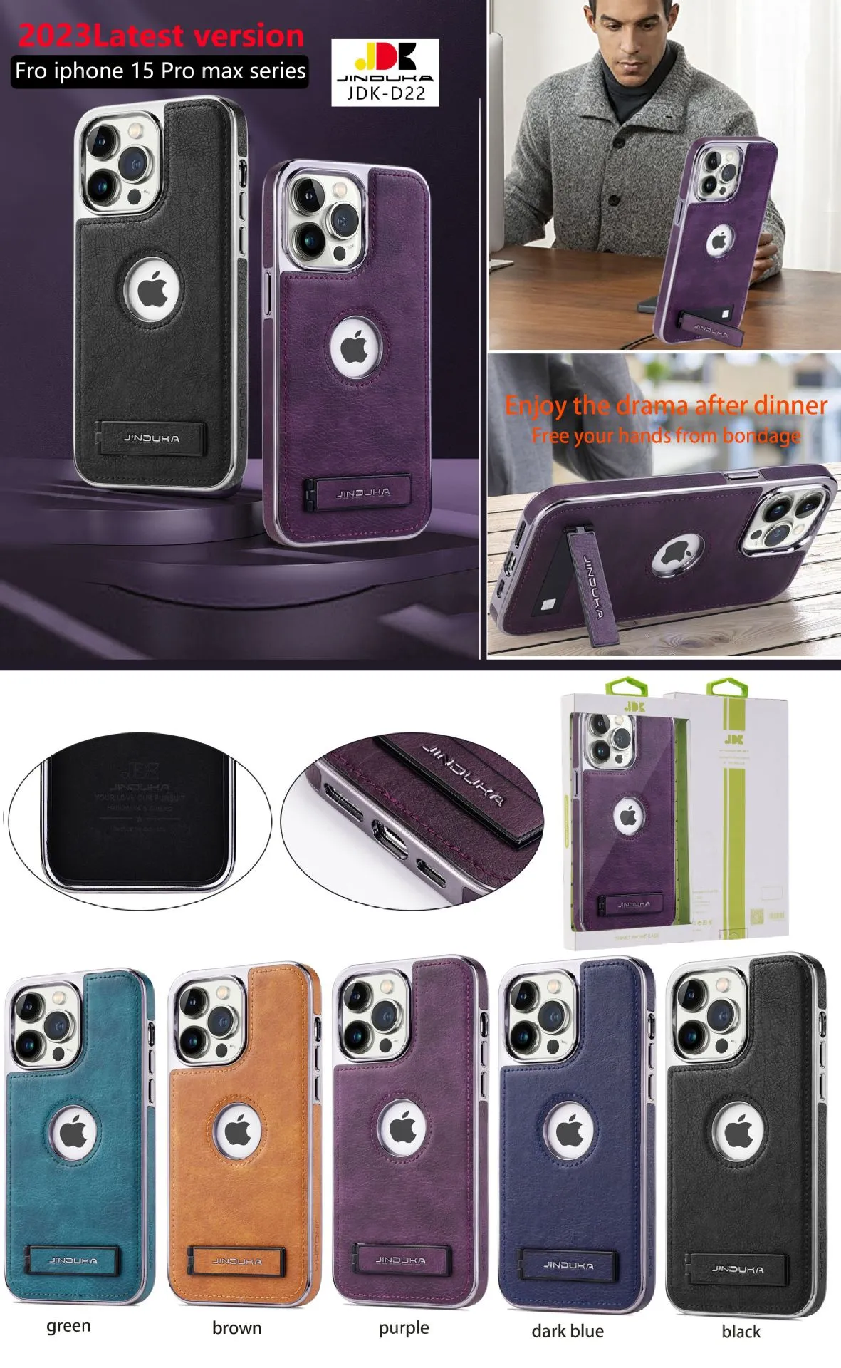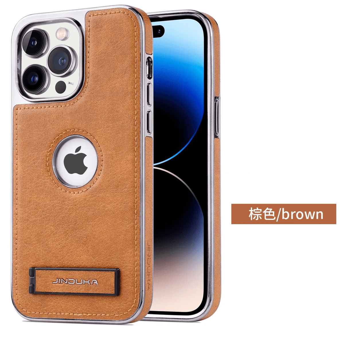 JDK Logo Cutout Luxury Plating Bumper Leather Folding Kickstand Phone Case For iPhone 16 15 14 Pro Max Series
