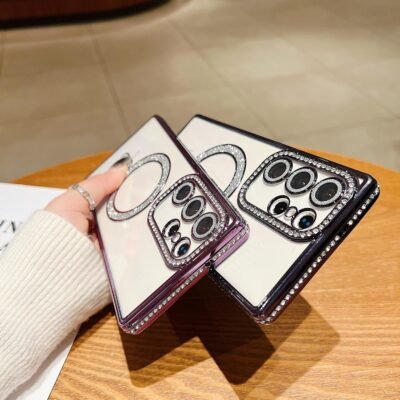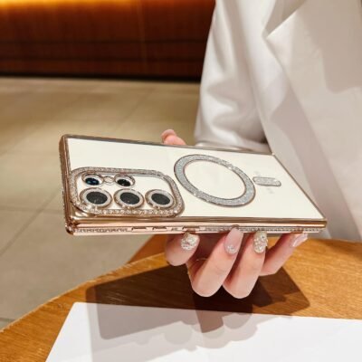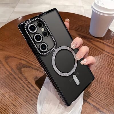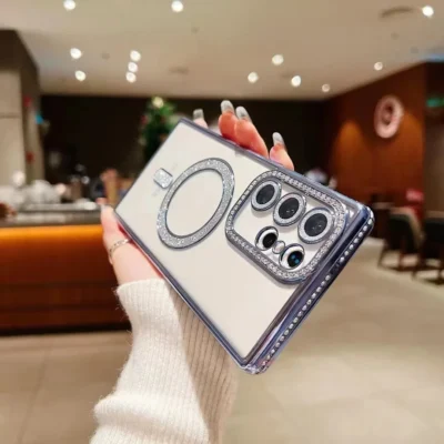 Samsung Galaxy S23/S24/S25 Ultra Magnetic Case with Glitter Diamond Camera Protector, Luxury Plating Bling Rhinestones Soft Bumper Clear Transparent Phone Case