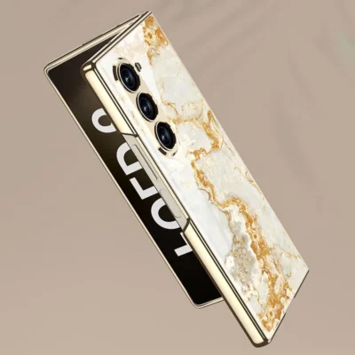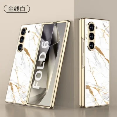 Samsung Galaxy Z Fold 5/6 Series Stylish Marble Gold Electroplated Frame with Patterned Glass, Built-in Screen Protector