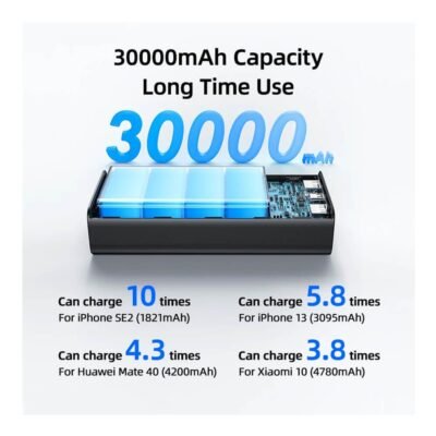 It only takes few hours to fully recharge the 30,000mAh power bank. Featuring 3-input:PD + Dual QC3.0 Fast charge outputs, provides high convenience of recharging this power bank with any of these 3 widely used cables